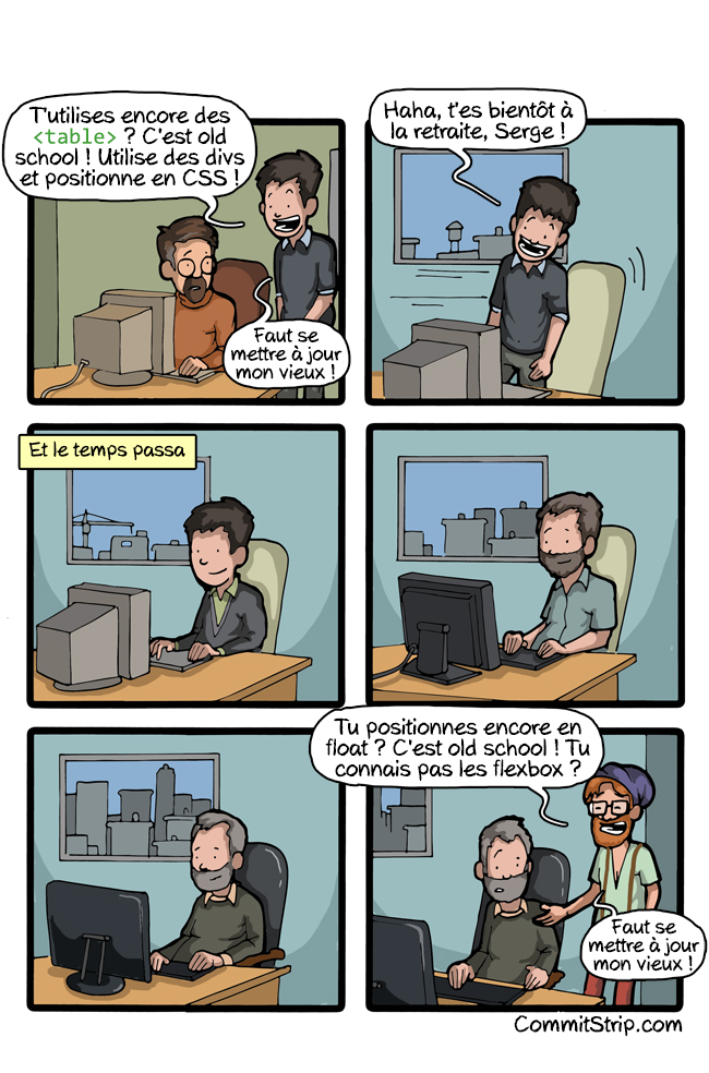 Pendant longtemps, des mises en page ont été créées avec le positionnement “Float”. Depuis l’introduction du CSS3, on peut utiliser le module CSS Flexbox. Pour l’avenir, le module CSS Grid Layout propose des solutions intéressantes.