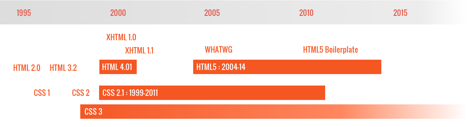 Durant ses 25 années d’existance, le standard HTML a connu diverses évolutions. La première version proposée en 1991 comportait 18 éléments. Différentes versions du standard HTML sont publiées, jusqu’à la version HTML 4.01 en 1999.
